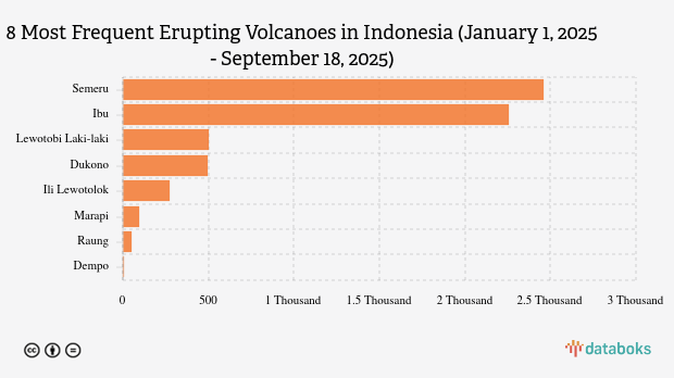 Throughout 2025, MAGMA Indonesia has recorded 6,139 volcanic eruptions across Indonesia. Mount Semeru in East Java had the most eruptions (2,458 times), while Mount Ili Lewotolok erupted 275 times.