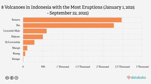 Throughout 2025, MAGMA Indonesia has recorded 6,272 volcanic eruptions across Indonesia. Mount Semeru in East Java had the most eruptions, with 2,474 occurrences.