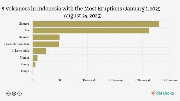 Throughout 2025, MAGMA Indonesia has recorded 5,769 volcanic eruptions across Indonesia. Mount Semeru in East Java erupted the most (2,305 times), while Mount Lewotobi Laki-laki erupted 478 times.