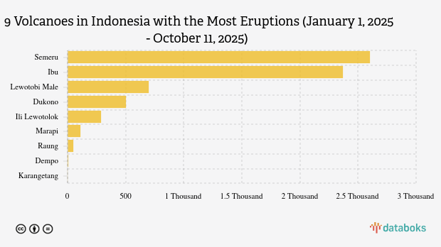 Throughout 2025, MAGMA Indonesia has recorded 6,615 volcanic eruptions across Indonesia. Mount Semeru in East Java has erupted the most with 2,600 times.