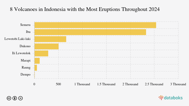 Throughout 2025, MAGMA Indonesia has recorded 6,473 volcano eruptions across Indonesia. Mount Semeru in East Java had the most eruptions (2,537 times) while Mount Ibu erupted 2,329 times.