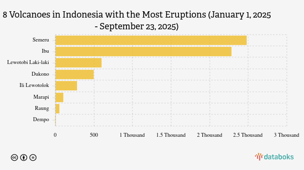 Throughout 2025, MAGMA Indonesia has recorded 6,293 volcanic eruptions across Indonesia. Mount Semeru in East Java had the most eruptions (2,478 times), while Mount Lewotobi Laki-laki erupted 600 times.
