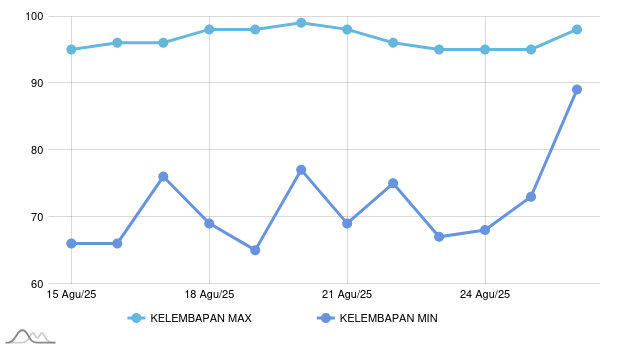 The Meteorology, Climatology, and Geophysics Agency (BMKG) reports light rain in Sigi today. Over the next week, there is a chance of light rain once, on Saturday, April 5th, 2025. Otherwise, Saturday, April 5th, 2025 will have light rain and Sunday, April 6th, 2025 will be cloudy. According to BMKG, thunderstorms are not expected in the next week.