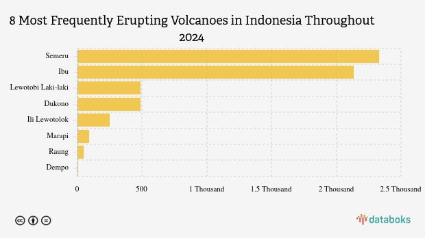 Throughout 2025, MAGMA Indonesia has recorded 5,832 volcanic eruptions across Indonesia. Mount Semeru in East Java had the most eruptions (2,332 times), while Mount Lewotobi Laki-laki erupted 489 times.