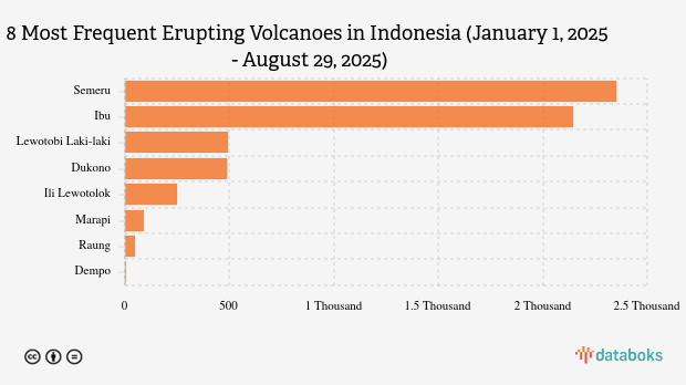 Throughout 2025, MAGMA Indonesia has recorded 5,874 volcano eruptions across Indonesia. Mount Semeru in East Java erupted the most (2,353 times) while Mount Ibu erupted 2,146 times.
