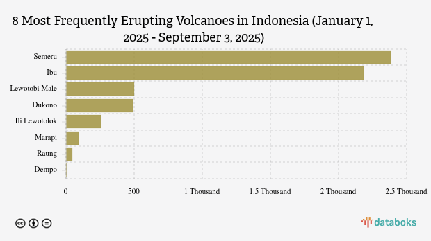 Throughout 2025, MAGMA Indonesia has recorded 5,953 volcanic eruptions across Indonesia. Mount Semeru in East Java had the most eruptions (2,383 times), while Mount Ibu erupted 2,182 times.