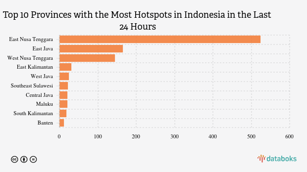 The most detected hotspots were in East Nusa Tenggara with 524 points. East Java ranked second with the highest number of hotspots at 165 points. West Nusa Tenggara was in third place with 144 hotspots.