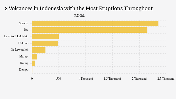 Throughout 2025, MAGMA Indonesia has recorded 5,889 volcano eruptions across Indonesia. Mount Semeru in East Java had the most eruptions (2,358 times) while Mount Ibu erupted 2,151 times.