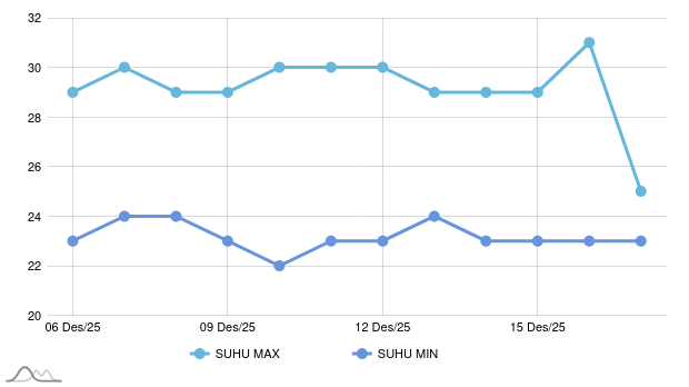 The highest and lowest temperatures in Tabalong occurred on Thursday, December 26, 2024, ranging from 32°C to 23°C. High humidity levels will exacerbate the feeling of heat. Here's a detailed weather forecast for Tabalong for the next week: