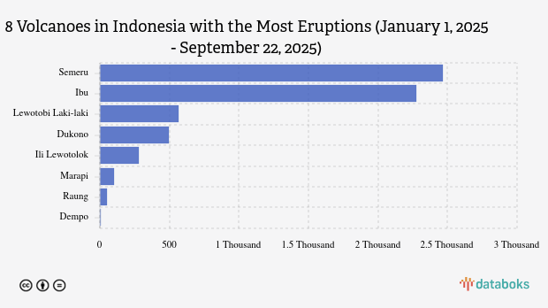 During 2025, MAGMA Indonesia recorded 6,238 volcanic eruptions across Indonesia. Mount Semeru in East Java had the most eruptions, with 2,468 events.