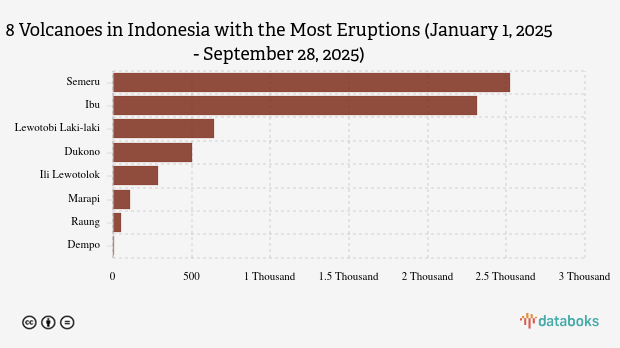 Throughout 2025, MAGMA Indonesia has recorded 6,419 volcanic eruptions across Indonesia. Mount Semeru in East Java had the most eruptions (2,522 times) while Mount Lewotobi Laki-laki erupted 642 times.