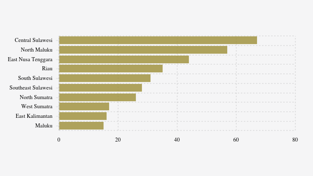 The highest number of hotspots were detected in Central Sulawesi with 67 points. North Maluku ranks second with the most hotspots, with 57 points. East Nusa Tenggara is in third place with 44 hotspots.