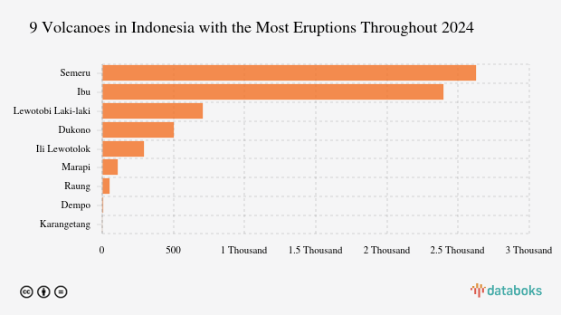 Throughout 2025, MAGMA Indonesia has recorded 6,680 volcanic eruptions across Indonesia. Mount Semeru in East Java had the most eruptions (2,627 times), while Mount Ibu erupted 2,395 times.