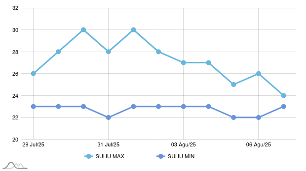 Bantaeng's highest temperature was 30°C on Tuesday, April 1st, 2025, and the lowest was 22°C on Sunday, April 6th, 2025. High humidity levels will exacerbate the feeling of heat. Here's a detailed weather forecast for Bantaeng for the next week: