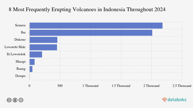 Throughout 2025, MAGMA Indonesia has recorded 5,429 volcanic eruptions across Indonesia. Mount Semeru in East Java had the most eruptions (2,178 times) while Mount Ibu erupted 2,010 times.