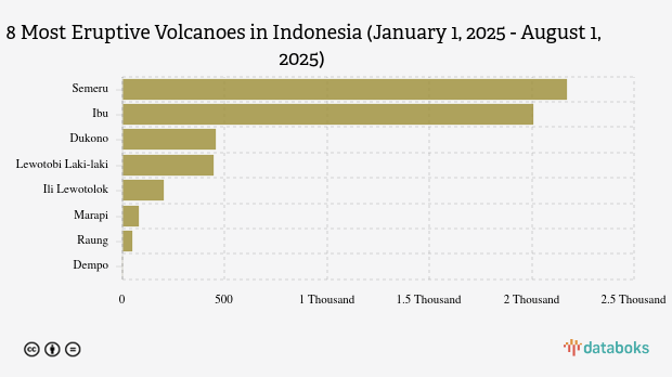 Throughout 2025, MAGMA Indonesia has recorded 5,415 volcanic eruptions across Indonesia. Mount Semeru in East Java had the most eruptions (2,173 times) while Mount Ibu erupted 2,005 times.