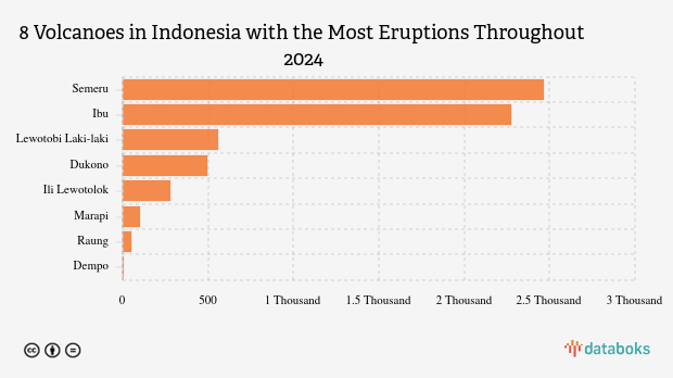 Throughout 2025, MAGMA Indonesia has recorded 6,228 volcanic eruptions across Indonesia. Mount Semeru in East Java erupted the most (2,466 times) while Mount Lewotobi Laki-laki erupted 557 times.