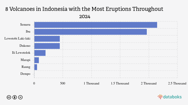 Throughout 2025, MAGMA Indonesia has recorded 5,326 volcanic eruptions across Indonesia. Mount Semeru in East Java had the most eruptions with 2,143 occurrences.