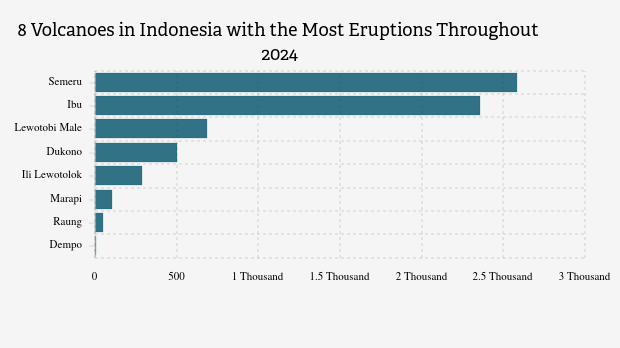Throughout 2025, MAGMA Indonesia has recorded 6,574 volcanic eruptions across Indonesia. Mount Semeru in East Java had the most eruptions (2,581 times) while Mount Ibu erupted 2,358 times.