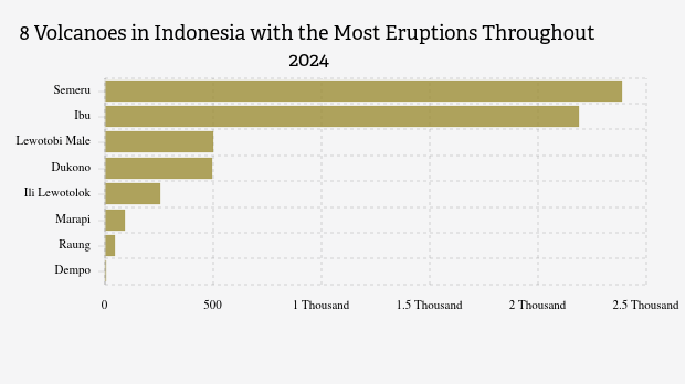 Throughout 2025, MAGMA Indonesia has recorded 5,969 volcanic eruptions across Indonesia. Mount Semeru in East Java had the most eruptions (2,389 times), while Mount Ibu erupted 2,187 times.