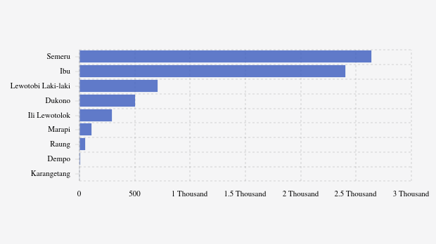 Throughout 2025, MAGMA Indonesia has recorded 6,698 volcanic eruptions across Indonesia. Mount Semeru in East Java had the most eruptions (2,635 times), while Mount Ibu erupted 2,404 times.