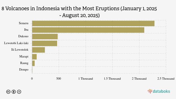 Throughout 2025, MAGMA Indonesia has recorded 5,702 volcanic eruptions across Indonesia. Mount Semeru in East Java had the most eruptions, with 2,285 occurrences.