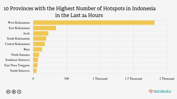 The most detected hotspots were in West Kalimantan, with 1,810 points. East Kalimantan ranked second with the highest number of hotspots at 338 points. Aceh was in third place with 221 hotspots.