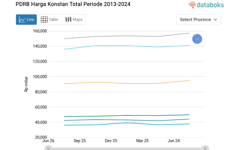 Berdasarkan data Badan Pusat Statistik (BPS), total PDRB harga konstan total seluruh Indonesia pada Juni 2024 mencapai Rp3,26 juta miliar.