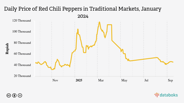 Regarding the price over the past month, the daily price of red chili peppers in traditional markets has decreased from a previous record of Rp48,350.