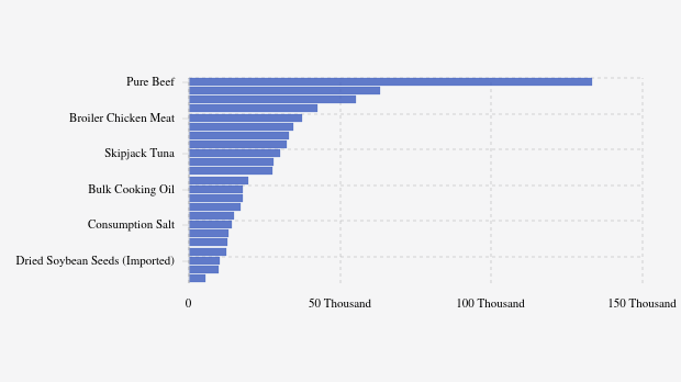 Commodities with increased prices include dried soybean seeds (imported), packaged cooking oil, premium rice, pure beef, and garlic.