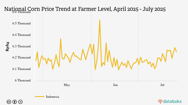 During the period April 2025 - July 2025, the lowest average corn price was Rp6,097 per kg on Wednesday, June 18, 2025. The highest price reached Rp6,533 per kg on Friday, June 6, 2025.