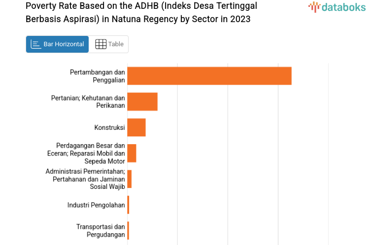 In terms of distribution, the main sector contributing the most to GRDP growth in Natuna Regency is mining and quarrying, with a contribution of 70.01%. Other sectors in the top five include agriculture, forestry, and fisheries; construction; wholesale and retail trade, repair of motor vehicles and motorcycles; and public administration, defense, and compulsory social security.