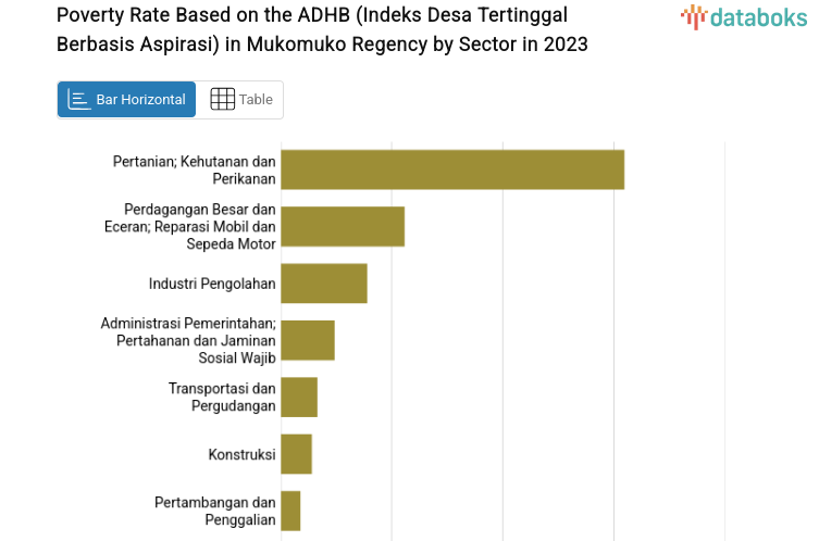 The 2023 Gross Regional Domestic Product (GRDP) at current prices in Mukomuko Regency was recorded at Rp6,799.6 billion. The GRDP in this district grew by 3.69% compared to the previous year's Rp6,217.19 billion.