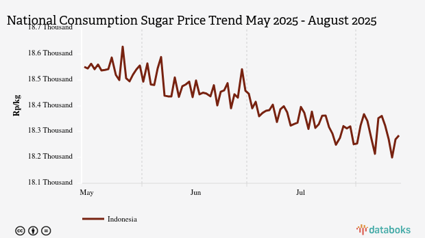 During the period of May 2025 - August 2025, the lowest average sugar price was Rp18,200 per kg on Monday, August 11, 2025. The highest price reached Rp18,628 per kg on Monday, May 26, 2025.
