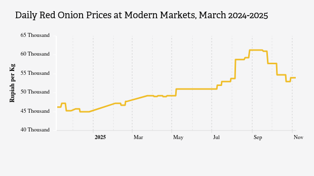 Compared to the price 30 days ago, the daily price of shallots in modern markets has increased from Rp45,700 per kg.