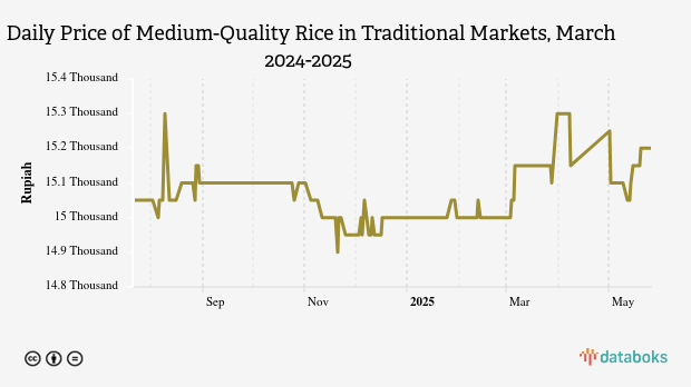 Compared to the price 30 days ago, the daily price of medium-quality grade I rice in traditional markets remained unchanged at Rp15,000.
