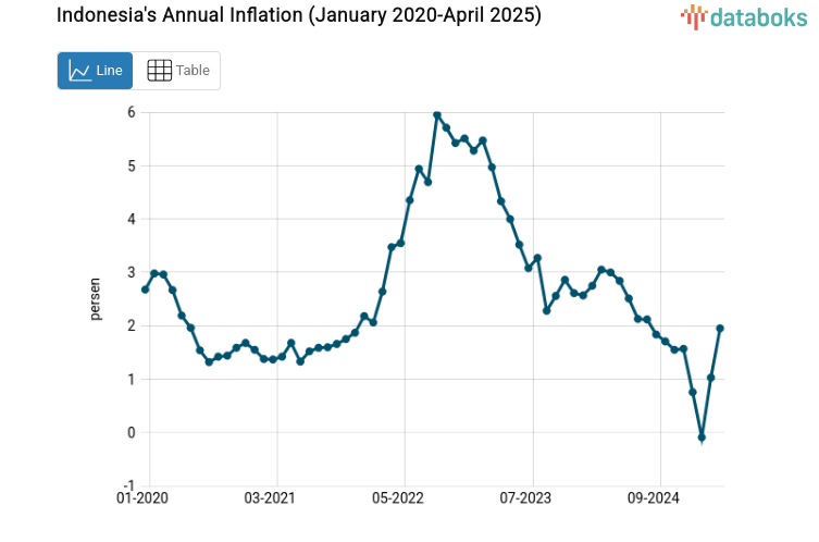 The Central Statistics Agency (BPS) reported that Indonesia experienced annual inflation of 1.95% (year-on-year/yoy) in April 2025.
