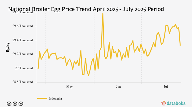 During the April 2025 - July 2025 period, the lowest average chicken egg price was Rp28,898 per kg on Wednesday, May 28, 2025. The highest price reached Rp29,786 per kg on Friday, June 6, 2025.