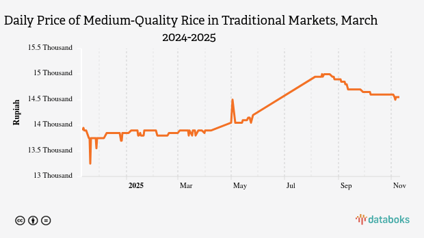 Compared to the price 30 days ago, the daily price of medium-quality I rice in traditional markets has increased from Rp13,850.