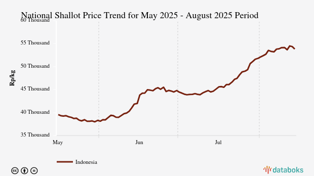 During the May 2025 - August 2025 period, the lowest average shallot price was Rp37,994 per kg on Friday, May 30, 2025. The highest price reached Rp54,510 per kg on Tuesday, August 12, 2025.
