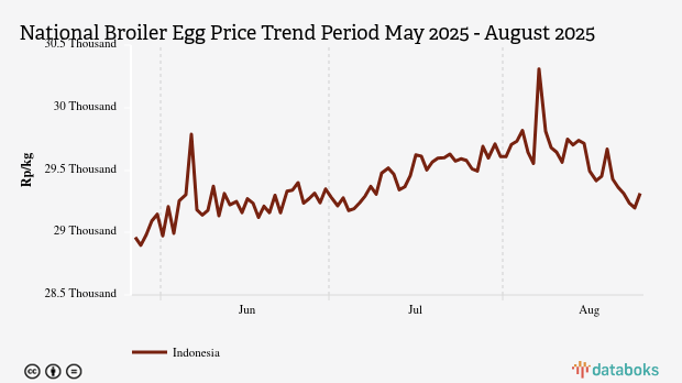 During the period of May 2025 - August 2025, the lowest average chicken egg price was Rp28,898 per kg on Wednesday, May 28, 2025. The highest price reached Rp30,309 per kg on Thursday, August 7, 2025.