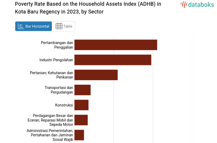 In 2023, the mining and quarrying sector in Kota Baru Regency recorded a value of Rp10.56 trillion (Note: The original text appears to have a typographical error, repeating "jutajuta," which translates to "millionmillion." It is corrected here to trillion based on context). This ranks first among the 17 sectors. This sector grew by 3.27% compared to the previous year's figure of Rp10.37 trillion (Note: Again, correcting the apparent typographical error in the original text).