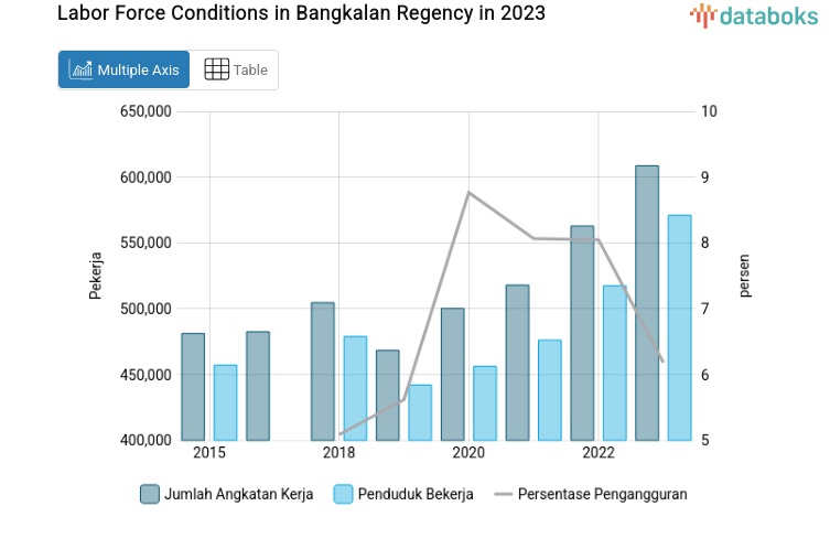 The decrease in the open unemployment rate (TPT) is reflected in the number of working people and the labor force figures published by BPS this year. The labor force in Bangkalan Regency has increased over the past three years. Historically, in 2021, there were 518,070 workers; this increased to 562,870 in 2022 and 608,800 in 2023.