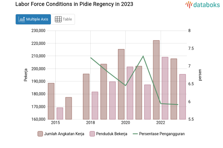 The reduction in the open unemployment rate (TPT) this year can be seen from the condition of the labor force and the number of people employed. The number of workers in Pidie Regency has decreased over the past three years. Historically, in 2021, there were 201,990 workers; this increased to 222,290 in 2022 and decreased to 207,830 in 2023.