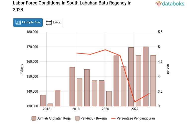 The increase in the open unemployment rate (TPT) is related to the data on the number of the workforce in this region. The number of workers in South Labuhan Batu Regency has increased over the past three years. Historically, in 2021, there were 164,420 workers; this increased to 169,500 in 2022 and to 170,020 in 2023.