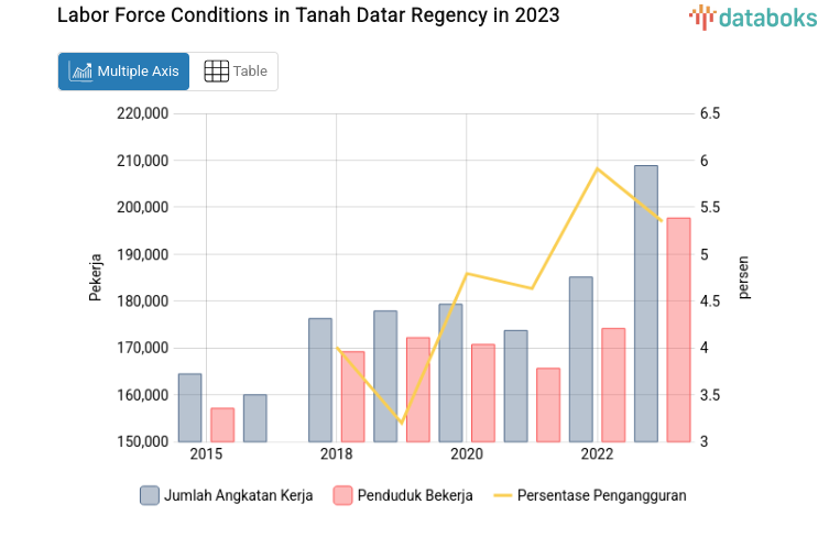 The decrease in the open unemployment rate (TPT) is reflected in the number of working people and the labor force figures published by BPS this year. The labor force in Tanah Datar Regency has increased over the past three years. Historically, in 2021, it was recorded at 173,730 workers; this increased to 185,100 in 2022 and to 208,880 in 2023.