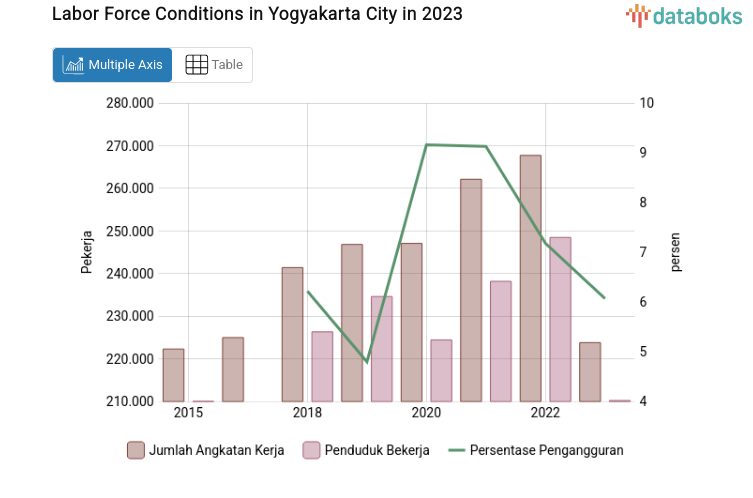 The decrease in the open unemployment rate (TPT) is reflected in the number of working people and the labor force figures published by BPS this year. The labor force in Yogyakarta City has shown an upward trend over the past 16 years. In 2021, the labor force was recorded at 262,120 workers, decreasing to 223,830 workers in 2023.