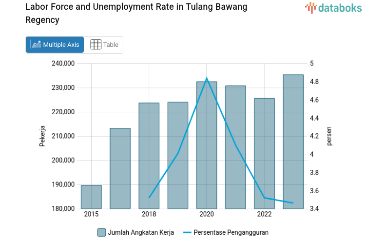 The reduction in the open unemployment rate (TPT) this year can be seen from the number of the workforce and the number of employed people. The number of the workforce in Tulang Bawang Regency has increased over the past three years. Historically, in 2021 there were 230,770 workers, in 2022 this decreased to 225,600 workers, and in 2023 it was recorded at 235,340 workers.