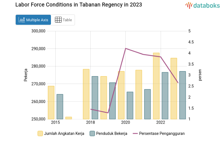 The reduction in the open unemployment rate (TPT) this year can be seen from the number of the workforce and the number of employed people. The number of the workforce in Tabanan Regency has decreased over the past three years. Historically, in 2021 there were 277,830 workers, increasing to 287,570 in 2022 and decreasing to 284,630 in 2023.