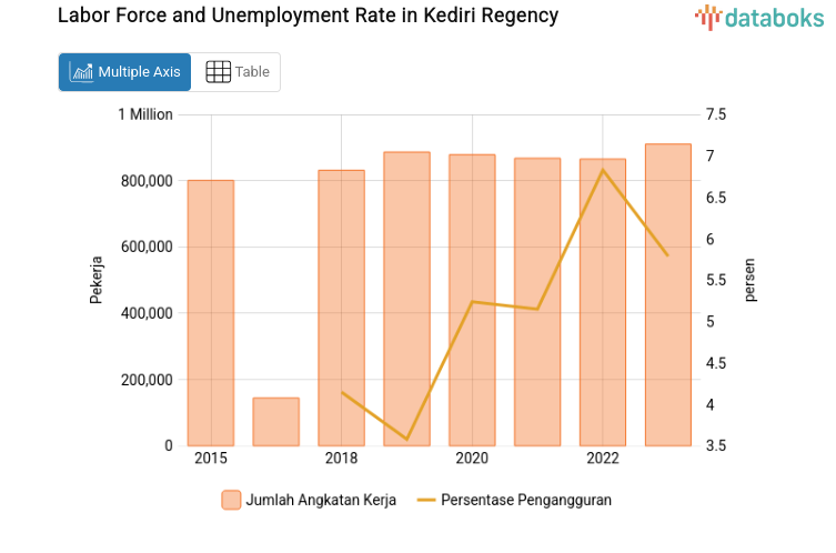 The reduction in the open unemployment rate (OUR) this year can be seen from the condition of the number of the workforce and the number of employed people. The number of the workforce in Kediri Regency has shown an upward trend over the past 16 years. In 2021, the number of workers was recorded at 867,700, increasing to 910,480 in 2023.